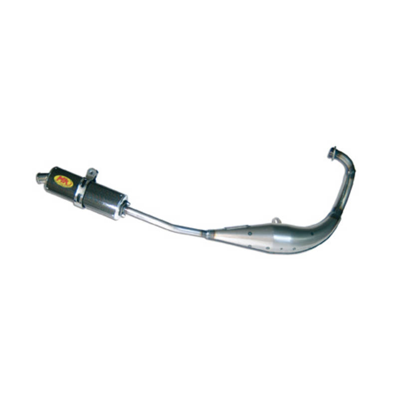 Handgeschweisste Rennauspuffanlage mit transparenter, hitzefester Speziallackierung für Zylinder von 50 bis 70ccm und Vergaser bis 21mm. Für mehr Beschleunigung und verbesserte Leistung in hohen Drehzahlen. Wahlweise mit Alu- oder Carbonschalldämpfer.