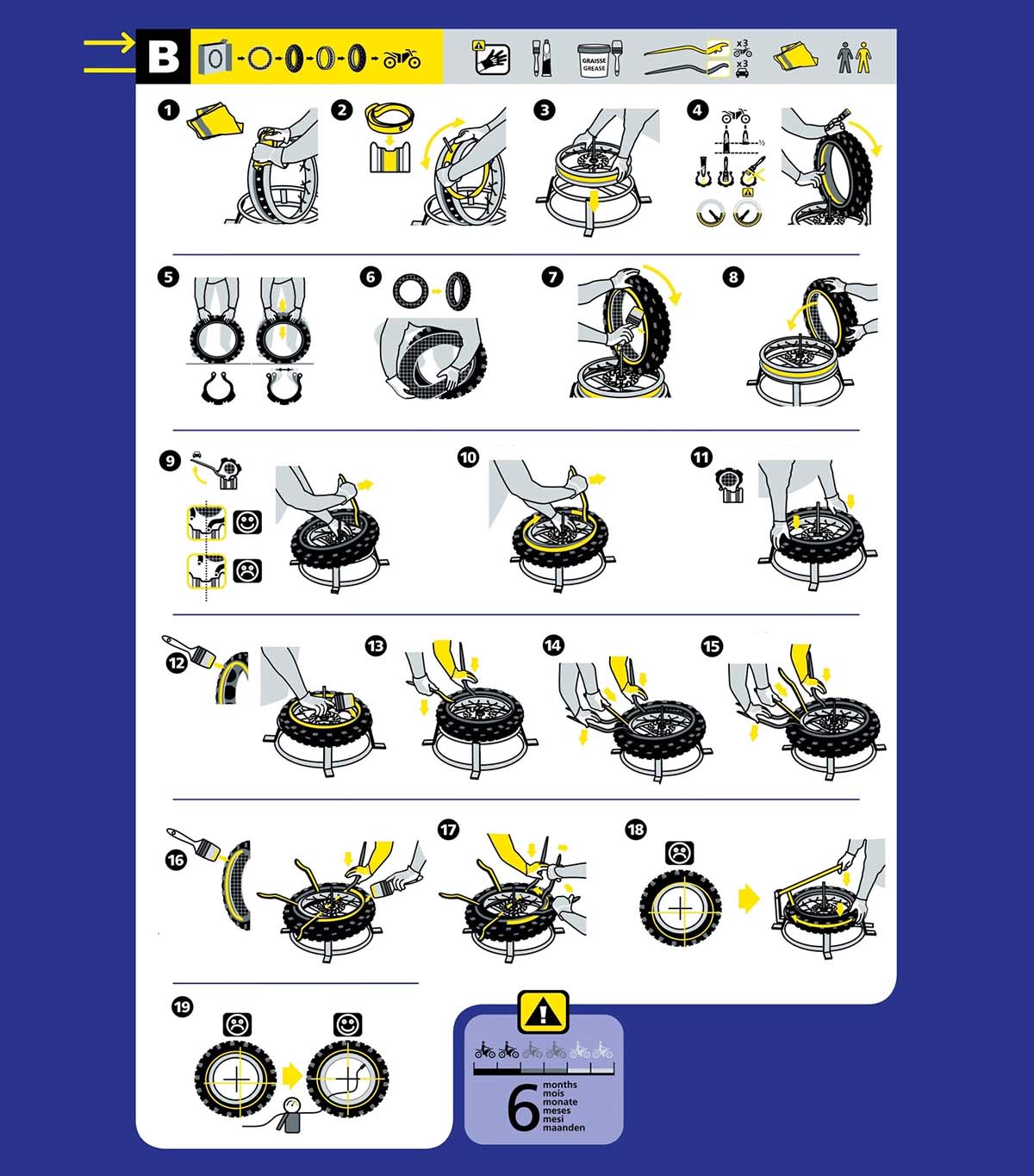 -Der Bib Mousse®-Ring sollte nur mit Michelin Offroad-Reifen verwendet werden, er ist genau an die Form dieser Michelin Reifen angepasst und eine Verwendung mit Reifen anderer Marken kann deshalb zu einem schlechteren Handling, Instabilität sowie Beschädigung des Rings führen
