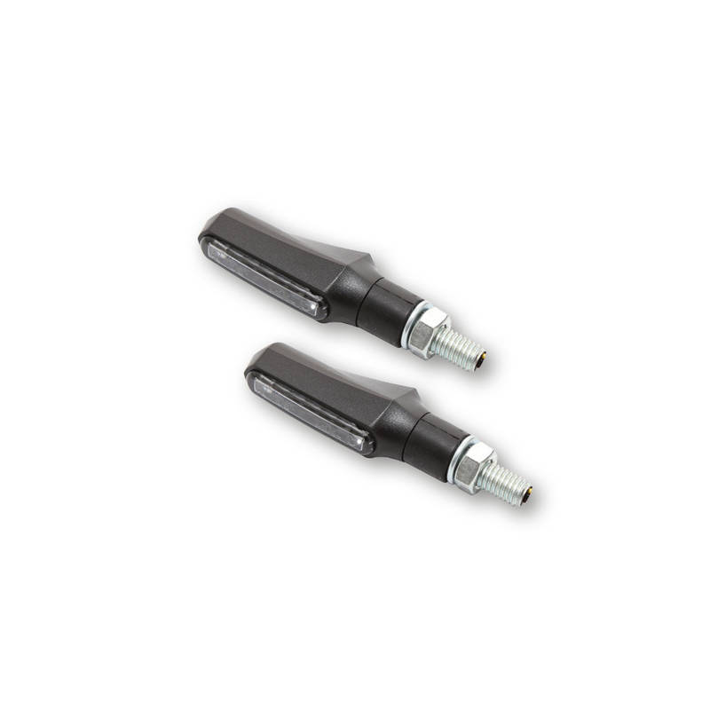 Ein modern designter Blinker mit der neusten Lichttechnik im robusten Kunststoffgehäuse in Schwarz, mit Gummistiel und getöntem Glas ist E-geprüft für vorne und hinten.