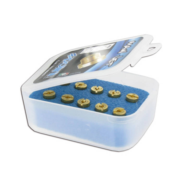 Vergaserhauptdüsen Set Dellorto 5mm. Ideales Kit zum Abstimmen deines Vergasers. 10 Hauptdüsen werden in einer praktischen Kunststoffbox geliefert, schön übersichtlich sortiert und jederzeit Griffbereit. Dazu noch einiges günstiger als wenn ihr die Düsen einzeln bestellt. Für alle 19 bis 21mm Dellorto Vergaser. Lieferbar in verschiedenen Abstufungen.