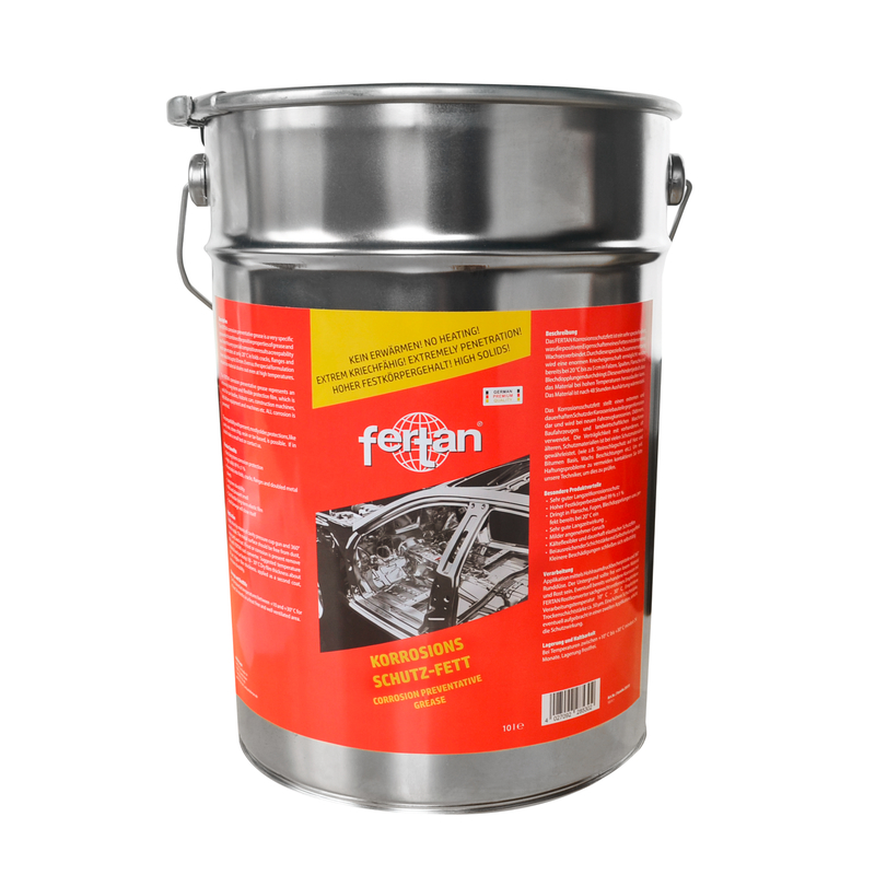 FERTAN Korrosionsschutzfett ist ein spezielles Schutzfett für Fahrzeuge und Maschinen. Die positiven Eigenschaften des Fettes sind Verarbeitung bei Raumtemperatur ca. 20°C, enormer Kriechfähigkeit und hoher Auslauftemperatur. Das bedeutet, dass das Fett ohne zusätzliche Erwärmung verarbeitet werden kann, sowohl als Spray mit besonderer 360° Sonde, wie auch in größeren Gebinden zur Verarbeitung mittels Hohlraum Druckbecher Pistole und Sonden. Dabei dringt das Fett durch dessen enorme Kriechfähigkeit auch problemlos in Falze, Überlappungen und Blechdoppelungen mehrere Zentimeter ein und haftet dort dauerhaft zum Schutz dieser Bauteile. Gleichzeitig ist sichergestellt, dass das Fett bei höheren Temperaturen nicht aus Öffnungen der Karosserie austritt, nicht zu Verschmutzungen führt und somit dauerhaft in der Karosserie verbleibt. Durch die enorme Elastizität, kann selbst bei Verwindungen der Karosserie im Fahrbetrieb, ein dauerhafter Schutz gewährleistet werden. Seine Verträglichkeit mit anderen Schutzmaterialien, wie Steinschlag- oder Unterboden- und Hohlraum – Schutzwachsen ist in nahezu allen Fällen gewährleistet. FERTAN Korrosionsschutz Fett eignet sich optimal für Restaurierungen, Wiederaufbau von historischen Fahrzeugen, aber auch für Alltagsfahrzeuge