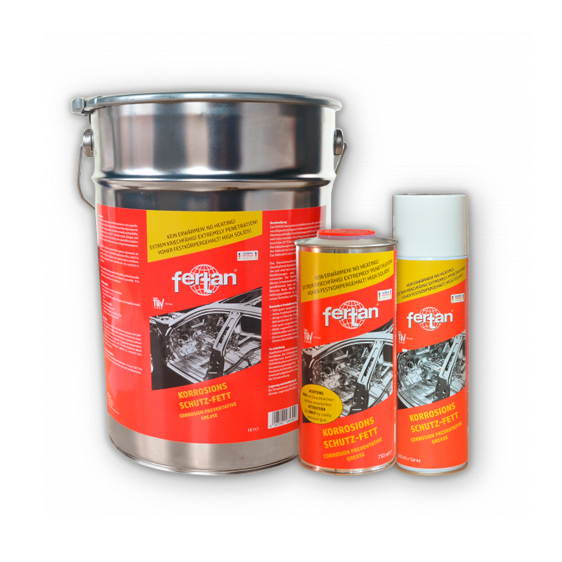 FERTAN Korrosionsschutzfett ist ein spezielles Schutzfett für Fahrzeuge und Maschinen. Die positiven Eigenschaften des Fettes sind Verarbeitung bei Raumtemperatur ca. 20°C, enormer Kriechfähigkeit und hoher Auslauftemperatur. Das bedeutet, dass das Fett ohne zusätzliche Erwärmung verarbeitet werden kann, sowohl als Spray mit besonderer 360° Sonde, wie auch in größeren Gebinden zur Verarbeitung mittels Hohlraum Druckbecher Pistole und Sonden. Dabei dringt das Fett durch dessen enorme Kriechfähigkeit auch problemlos in Falze, Überlappungen und Blechdoppelungen mehrere Zentimeter ein und haftet dort dauerhaft zum Schutz dieser Bauteile. Gleichzeitig ist sichergestellt, dass das Fett bei höheren Temperaturen nicht aus Öffnungen der Karosserie austritt, nicht zu Verschmutzungen führt und somit dauerhaft in der Karosserie verbleibt. Durch die enorme Elastizität, kann selbst bei Verwindungen der Karosserie im Fahrbetrieb, ein dauerhafter Schutz gewährleistet werden. Seine Verträglichkeit mit anderen Schutzmaterialien, wie Steinschlag- oder Unterboden- und Hohlraum – Schutzwachsen ist in nahezu allen Fällen gewährleistet. FERTAN Korrosionsschutz Fett eignet sich optimal für Restaurierungen, Wiederaufbau von historischen Fahrzeugen, aber auch für Alltagsfahrzeuge