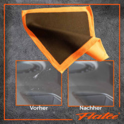 Mit stark seifenhaltigen Sprühwasser anwenden damit keine Kratzer auf dem Lack entstehen. Spuren vom Flatee Magic Towel bei zu trockener Anwendung können einfach mit Brennspiritus entfernt werden.