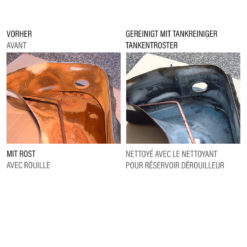 FERTAN Tankreiniger in den verrosteten Tank geben. Danach den Tank verschliessen und die Flüssigkeit durch Drehen und Wenden im Tank gut verteilen. Je nach Grad der Verschmutzung kann die Reinigung zwischen 2 h und 24 h betragen. Nach der Reinigung den Tank ausleeren und kräftig mit Wasser spülen, bis keine Rückstände mehr vorhanden sind. Nun kann die weitere Behandlung mit VERTAN Rostkonverter erfolgen. (Optimal davor die Entrostung mittels FeDOX Entrostungskonzentrat) Nach der Anwendung als Sondermüll entsorgen, kann Öl- und Kraftstoffrückstände enthalten.