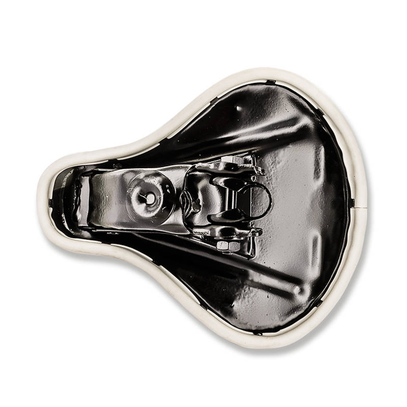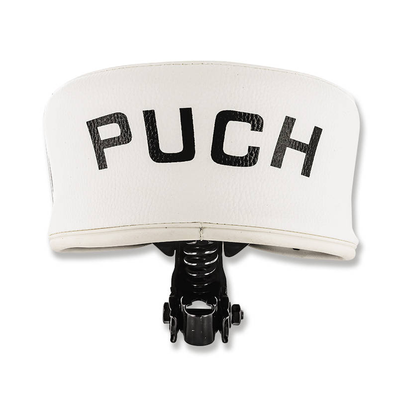 Sattel im originalen Look der alten Maxi N und 2-Gang Modelle mit weissem Leder bezogen. Der Sattel ist schön verarbeitet und hat auf der Hinterseite einen schwarzen „PUCH“ Schriftzug.