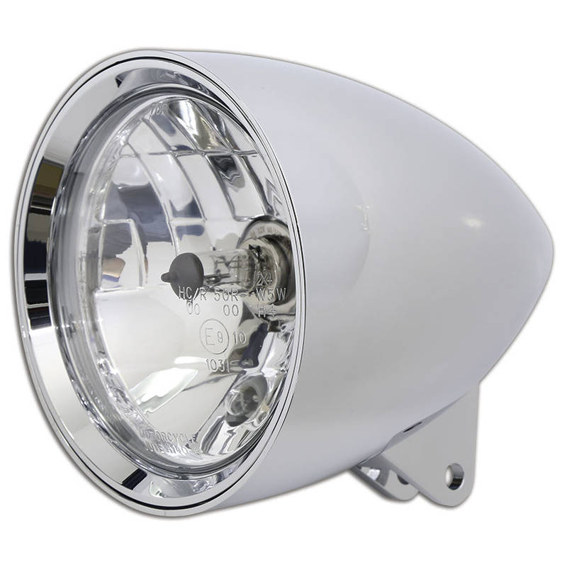 H4-Halogen-Hauptscheinwerfer mit einem hochwertig verarbeiteten, verchromten Aluminium-Gehäuse. Der Scheinwerfer verfügt über einen asymmetrischen – nur für den Rechtsverkehr zugelassenen – Prismenreflektor und Standlicht, E-geprüft.