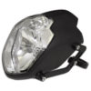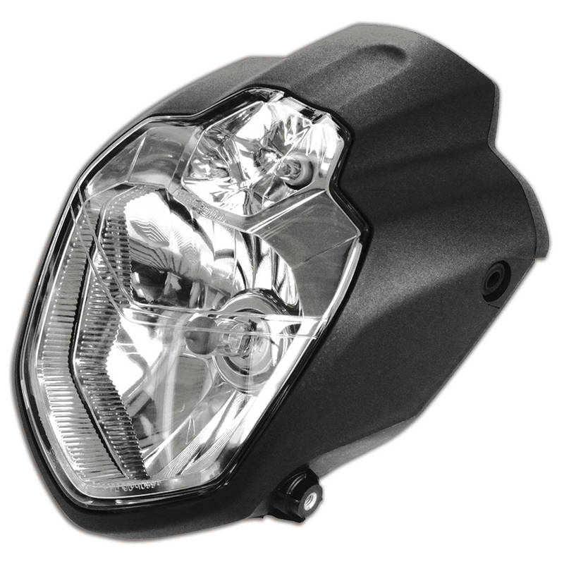 H4 Hauptscheinwerfer inklusive Standlicht in Yamaha MT-03-Optik in einem schwarzen Kunststoffgehäuse zur seitlichen Befestigung. Der Reflektor strahlt ein helles, symmetrisches Licht aus – für eine gute Fahrbahnausleuchtung und optimale Sicht, E-geprüft.